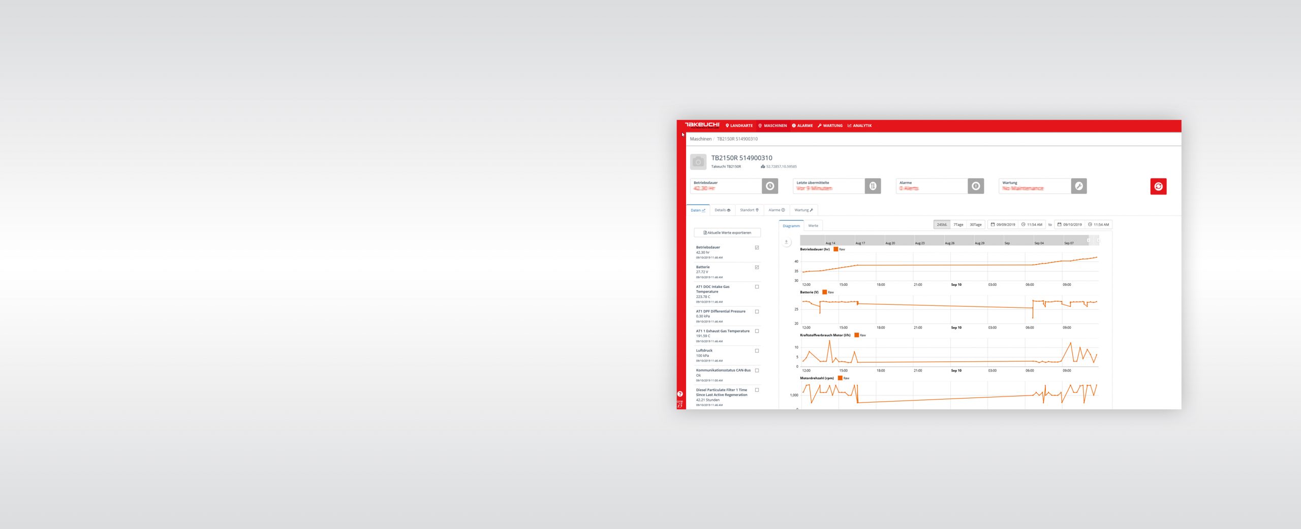 Mit TFM behalten Sie jederzeit alles im Blick. Sie wissen, wo sich Ihre Takeuchi Maschinen befinden, und kennen ihre Leistungsdaten und Wartungsintervalle. So können Sie den Service zeit- und kostentechnisch optimieren und für einen langen störungsfreien Betrieb sorgen.